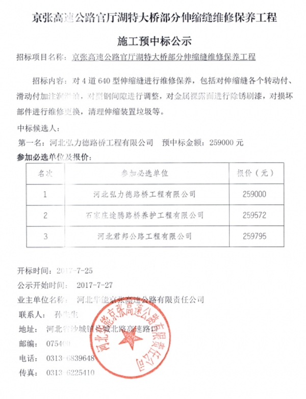 京張高速公路官廳湖特大橋部分伸縮縫維修保養(yǎng)工程施工預中標公示
